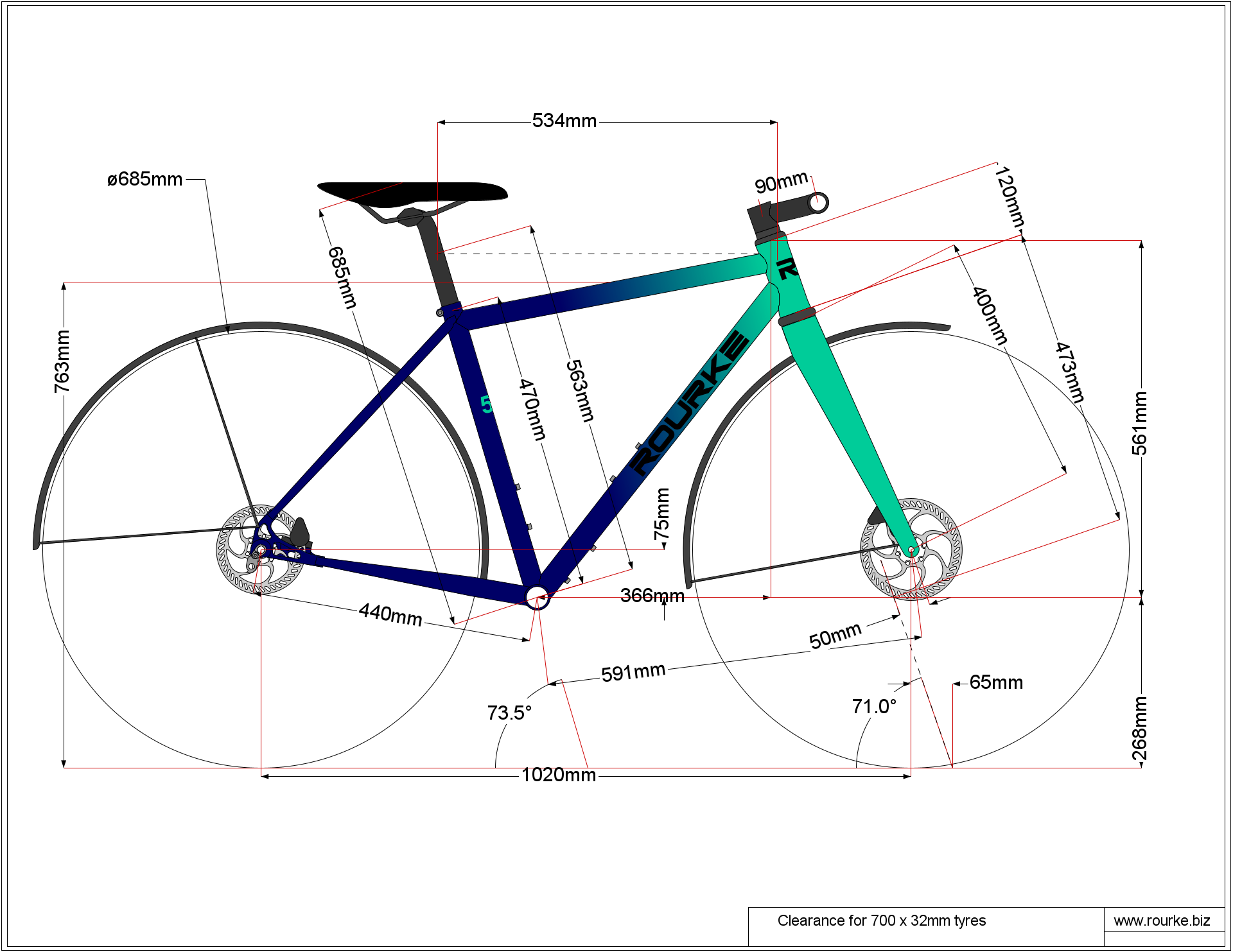 Frame is Fully fillet brazed and features Llewellyn Limpet cable stops finished in stainless. This is a 57mm drop brake caliper bike for use with or without mudguards and should clear upto 28mm tyres with guards fitted. Suggested fork pairing would be a Whisky No7 Road+ fork or steel forks can be made to suitClick here for frame drawing